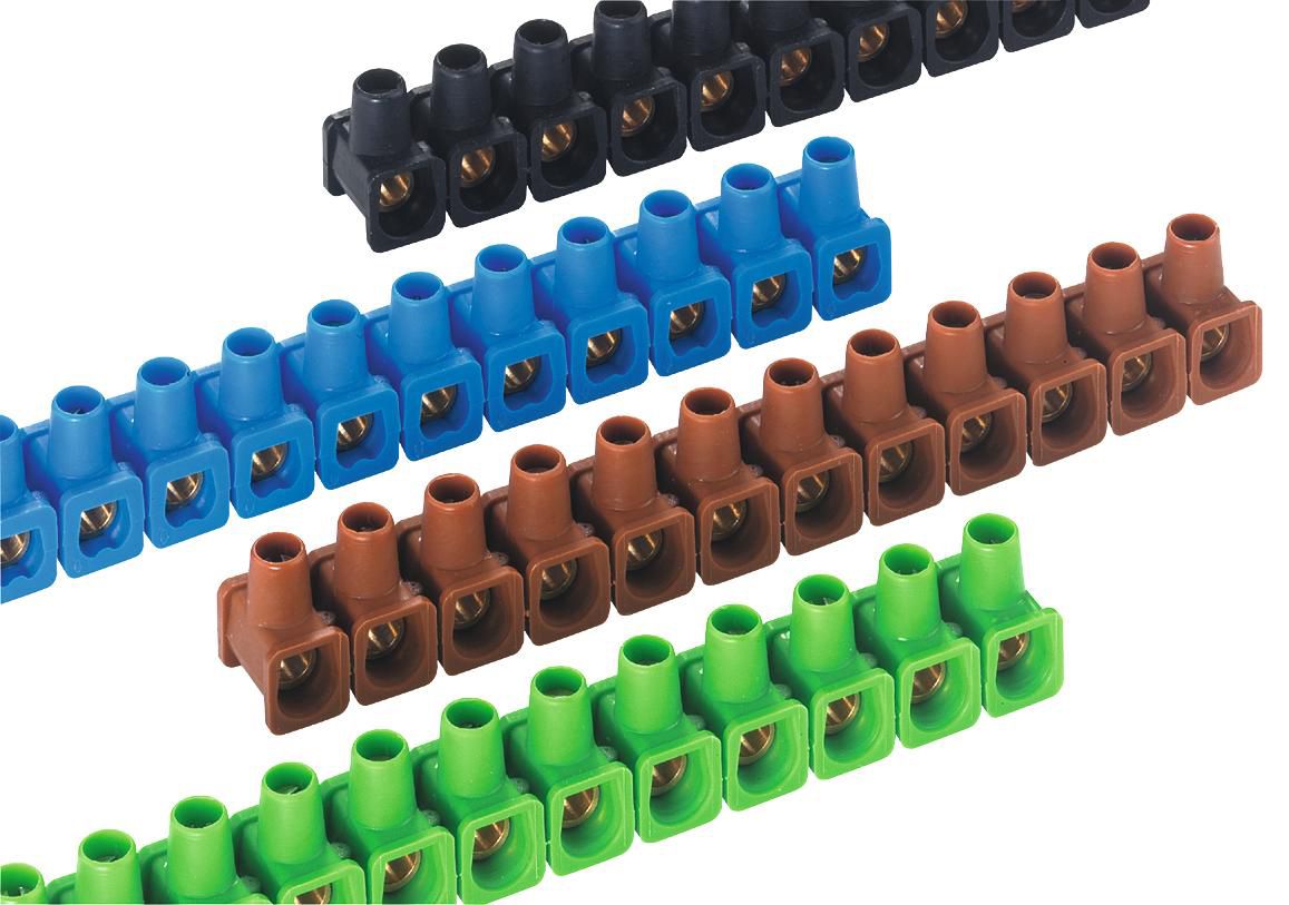 Klemmleiste, Dolü-Klemme, 12-polig, in Einzelklemmen abtrennbare Leiste, Schrauben hochgedreht, unverlierbar. Material: Polyamid. Farbig sortiert: 5x Schwarz, 2x Blau, 2x Gelbgrün, 1x Braun.