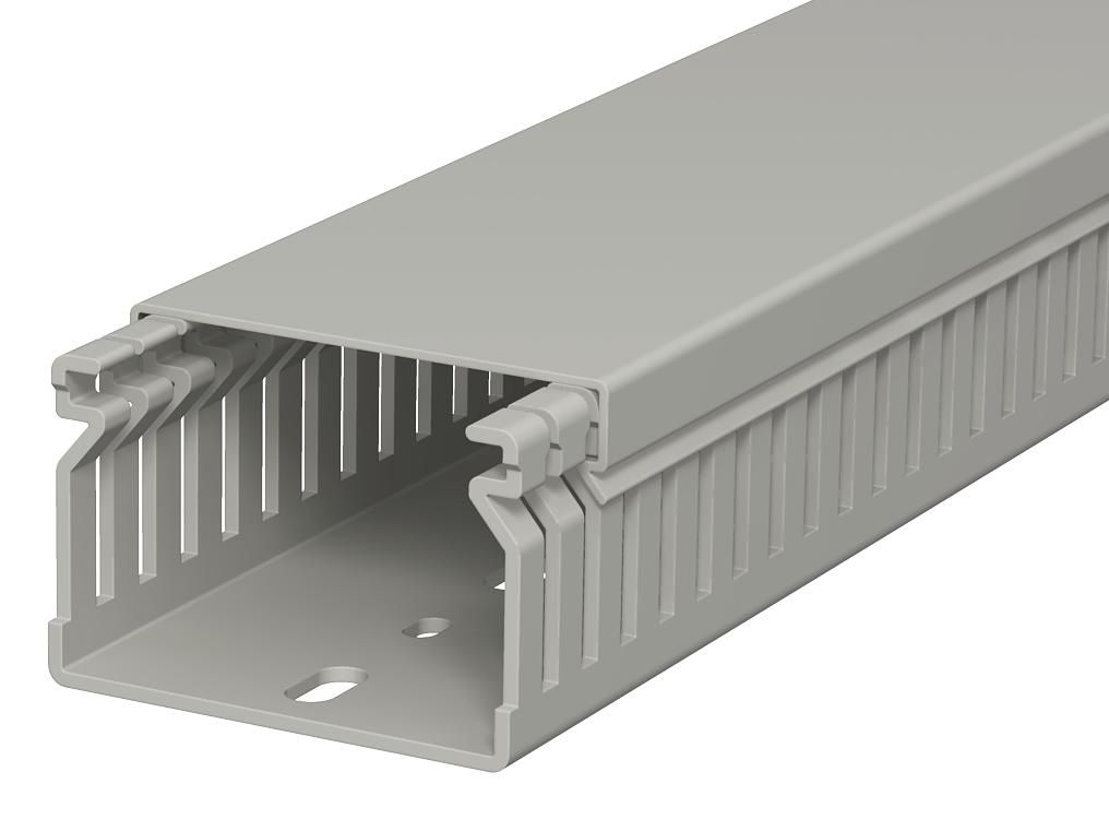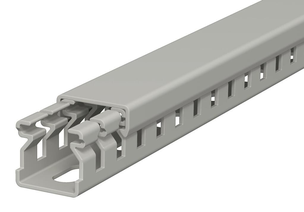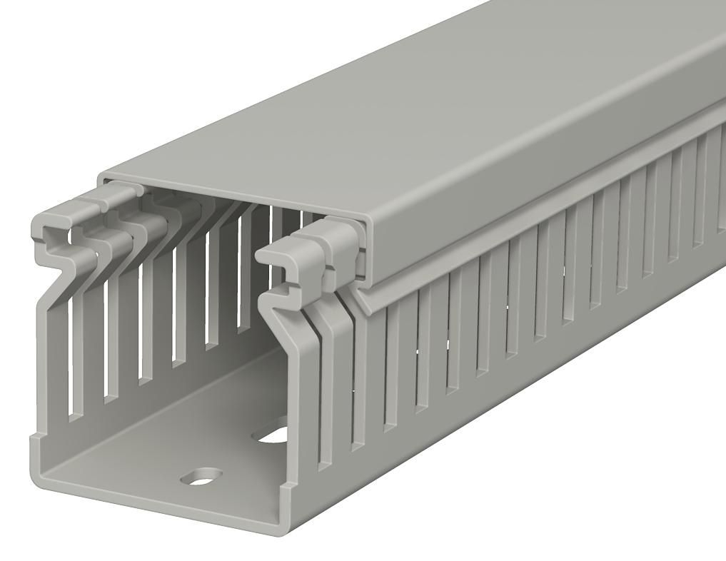 Verdrahtungskanal inkl. Oberteil und Bodenlochung zur waagerechten und senkrechten Verlegung elektrischer Kabel und Leitungen im Schaltschrank. Ausführung als metrischer Kanal. Das Nennmaß der Systemgröße entspricht dem Innenmaß der Kanäle. Das Ausbrechen der Stege erfolgt werkzeuglos. Bodenbündiges Ausführen ist durch Sollbruchstellen möglich. Geprüft nach DIN EN 50085-2-3. Sonderlängen auf Anfrage.