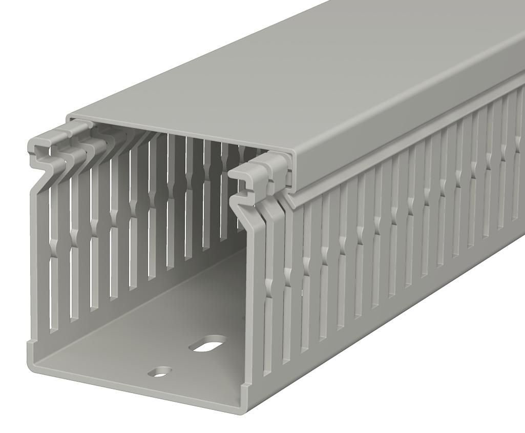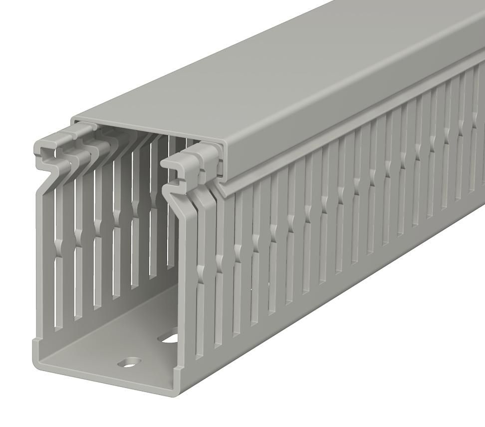 Verdrahtungskanal inkl. Oberteil und Bodenlochung zur waagerechten und senkrechten Verlegung elektrischer Kabel und Leitungen im Schaltschrank. Ausführung als metrischer Kanal. Das Nennmaß der Systemgröße entspricht dem Innenmaß der Kanäle. Das Ausbrechen der Stege erfolgt werkzeuglos. Bodenbündiges Ausführen ist durch Sollbruchstellen möglich. Verjüngungen in den Seitenschlitzen verhindern das Herausfallen der Leitungen. Geprüft nach DIN EN 50085-2-3. Sonderlängen auf Anfrage.