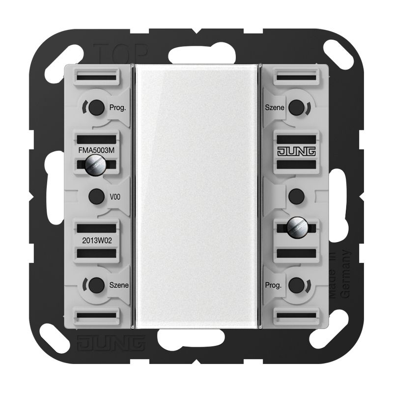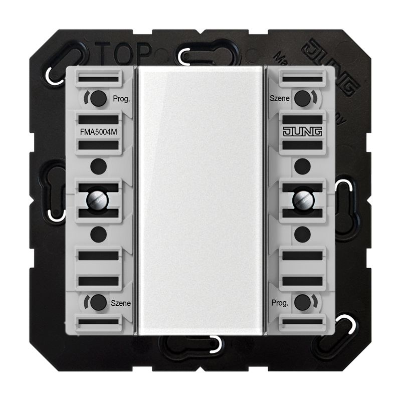 inklusive transparenter Abdeckung Art.-Nr.: A 50 NA inklusive Montageplatte, Klebefolie und Befestigungsschrauben für Tastensatz 1fach, Art.-Nr.: A 501 TSA .. Bestimmungsgemäßer Gebrauch Funksensor zur Übertragung von Schalt-, Dimm-, Jalousiefahr- und Szenenbefehlen Betrieb mit Funkaktoren aus dem eNet-System Montage auf Gerätedose mit Abmessungen nach DIN 49073, Schraubbefestigung auf Wänden oder Klebemontage auf glatten Flächen (Glasscheiben) Produkteigenschaften Je zwei nebeneinanderliegende Tasten gehören zu einem Kanal Anzeige des Aktorstatus bei Statusabfrage durch eine grüne LED je Kanal Anzeige des Übertragungsstatus durch eine rote LED Einschalthelligkeit von Dimmaktoren speicherbar Batteriebetriebenes Gerät (Batteriefach von vorne zugänglich) Signalisierung von Übertragungsfehler abschaltbar Mit eNet-Server einstellbar: Szene Alles-Ein Bediensperren Zusatzfunktionen mit eNet-Server: Vollverschlüsselte Funkübertragung (AES-CCM) ab eNet Server